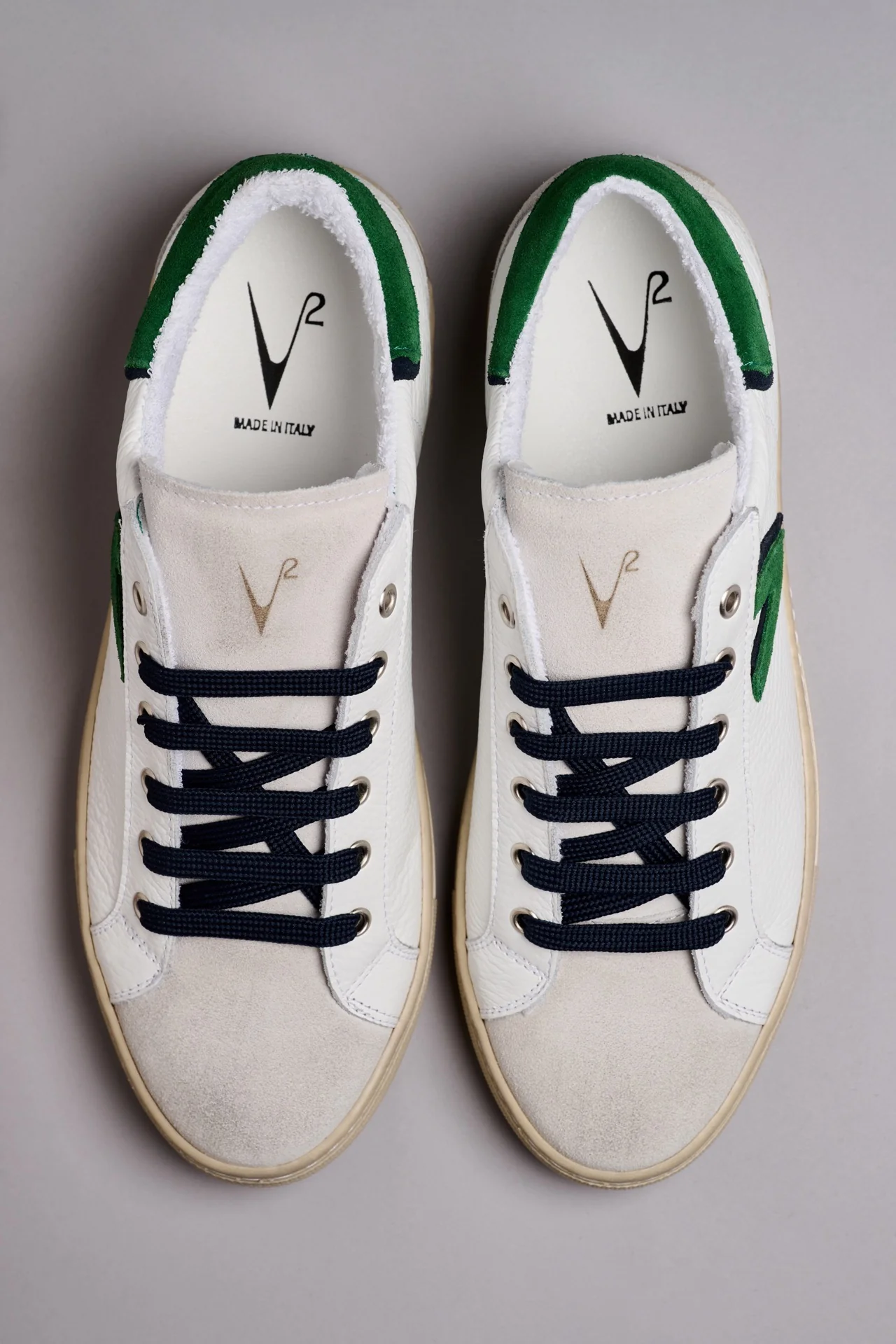 Retro bicolor in pelle scamosciata, doppio inserto laterale bicolor e lacci a contrasto: una scarpa originale, colorata e spensierata.