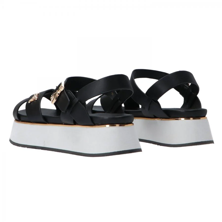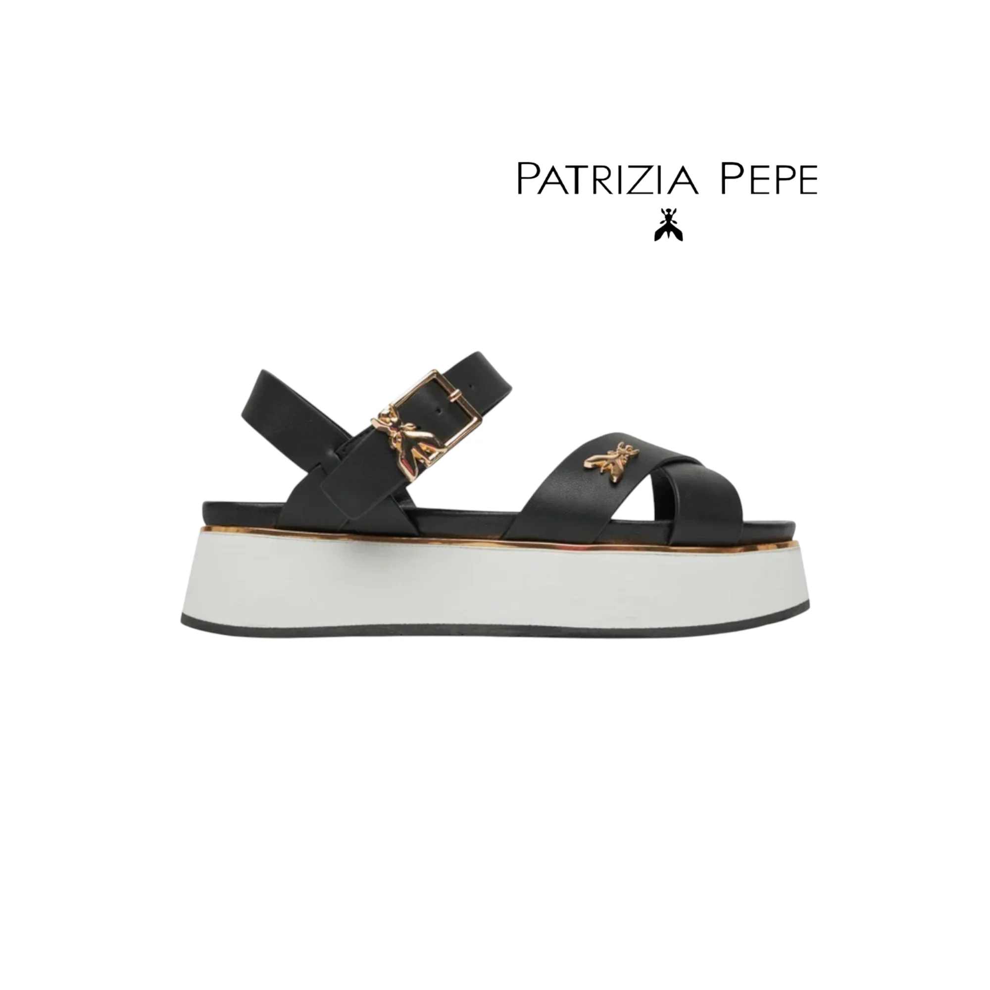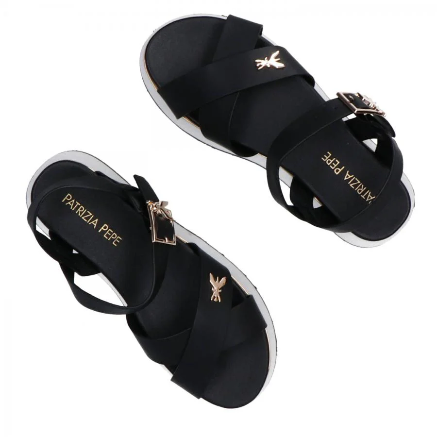 PATRIZIA PEPE SANDALI INCROCIO DONNA PJ334 NERO Sandali realizzati in pelle con fibbia regolabile logata, decorati da inserto metallico con logo del brand, comodo plantare anatomico realizzato in pelle e fondo in gomma platform con suola con trama antiscivolo