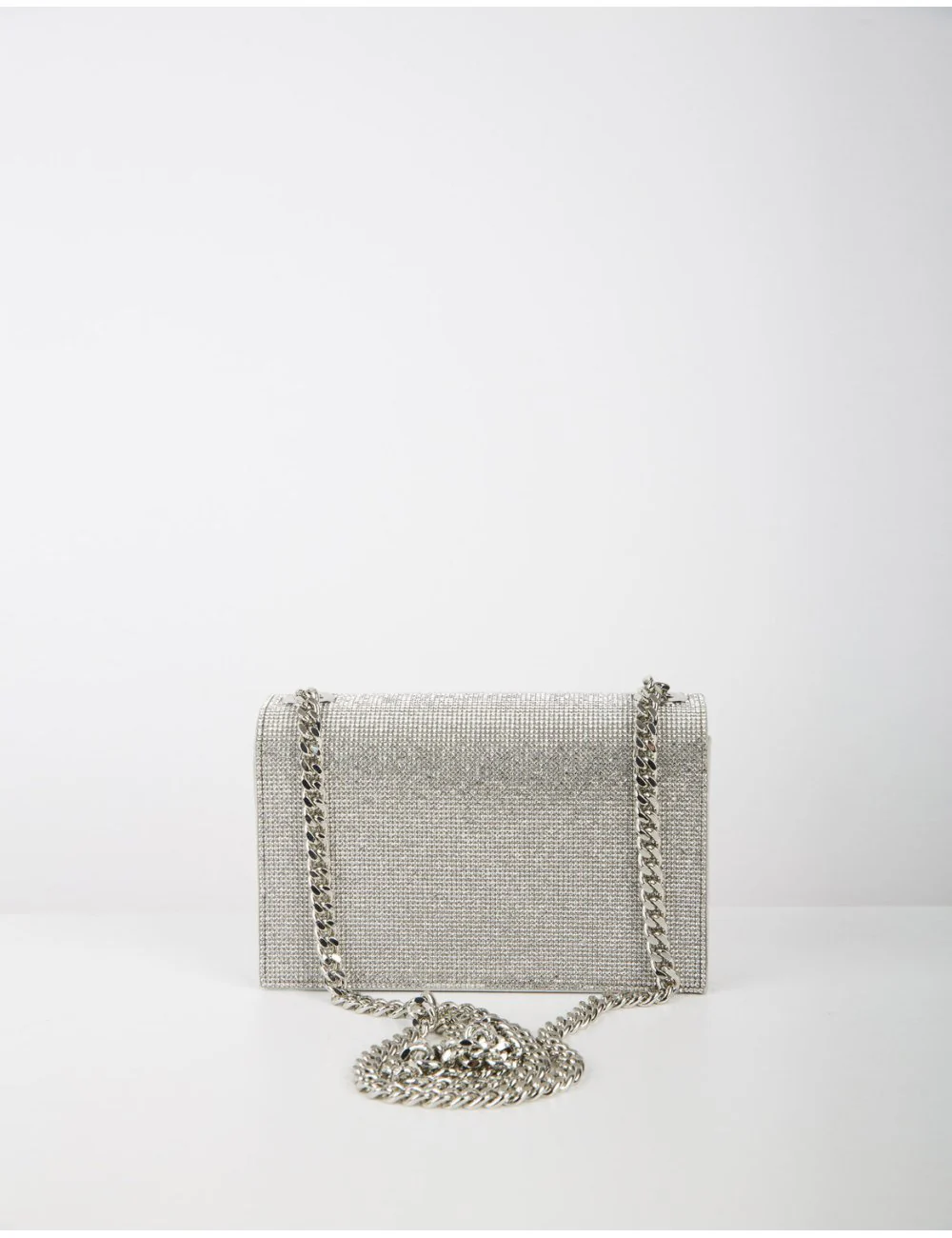 Pochette tinta unita, chiusura frontale, logo decorativo frontale effetto metallo, tracolla a catena inclusa.