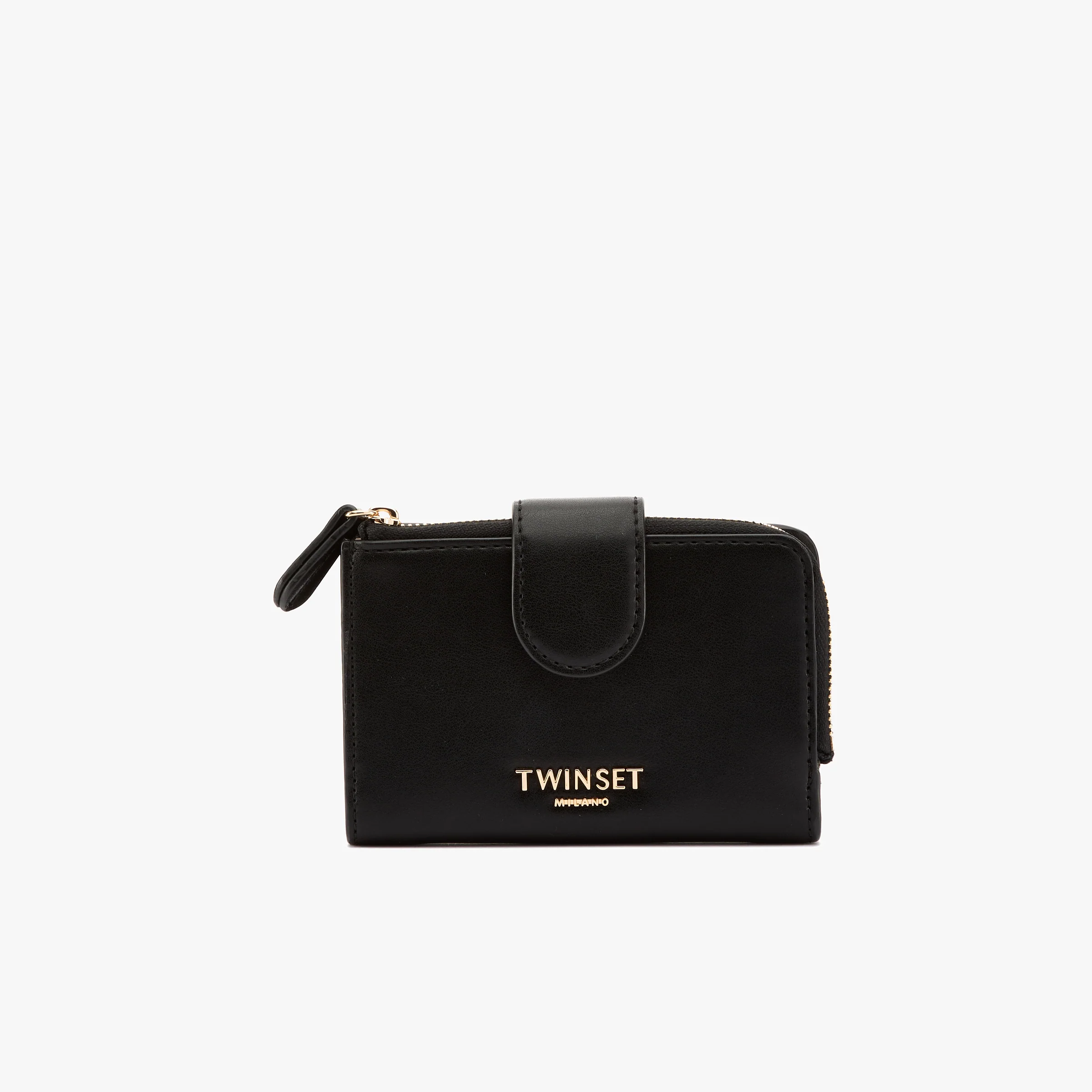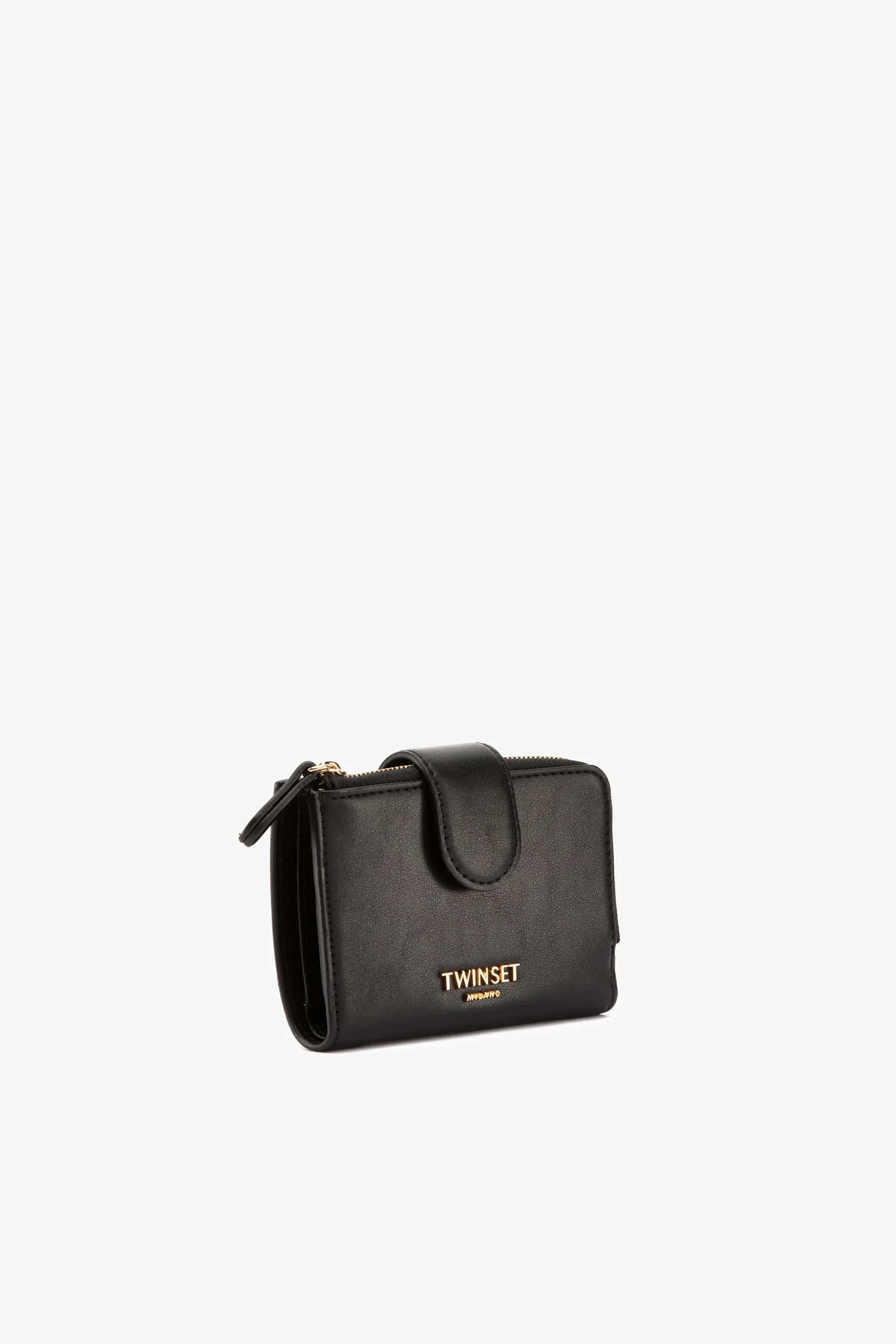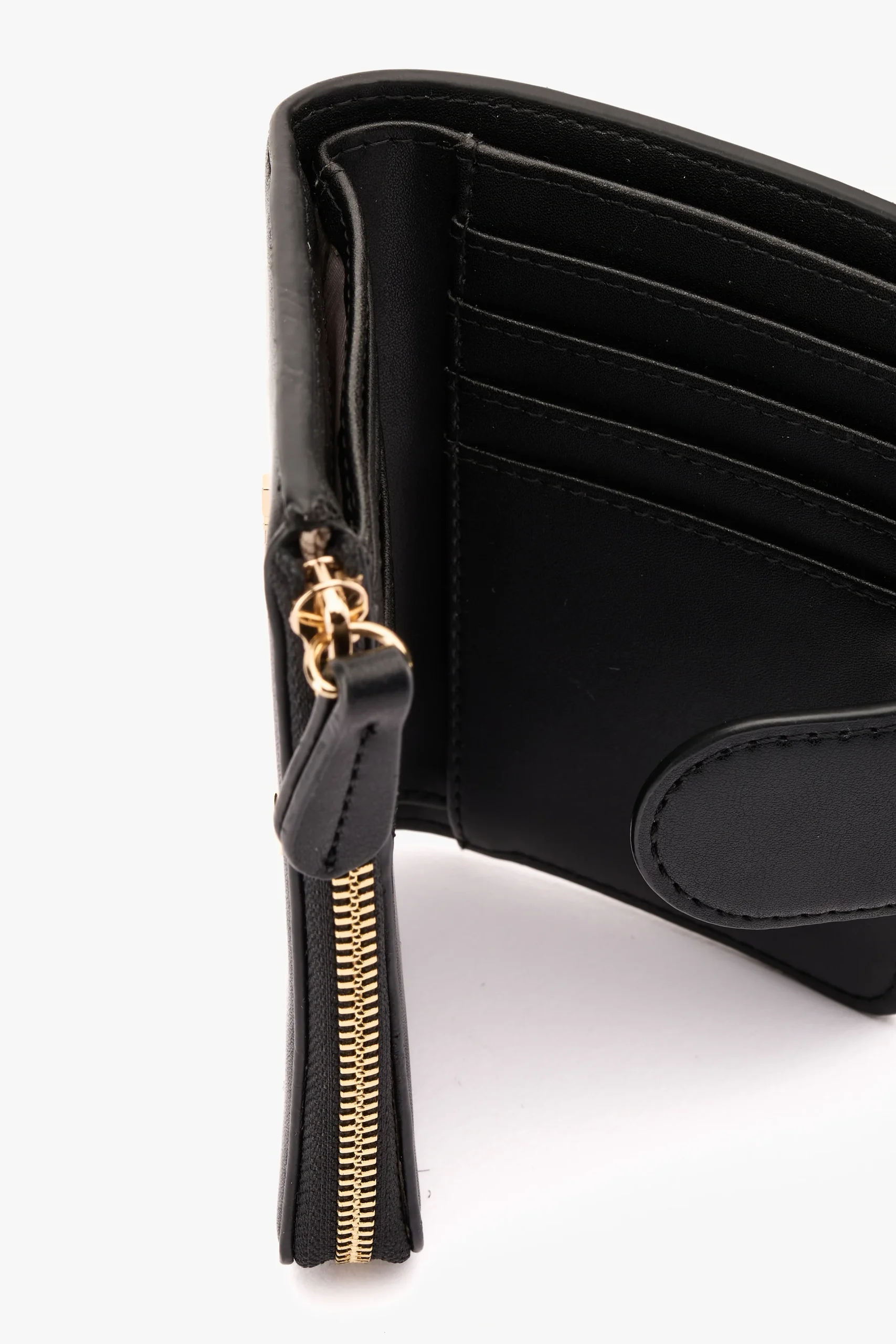 Portafoglio in pelle vegetale nero con bottone Scomparto porta banconote, porta carte e tasca porta monete con zip 13×9 cm