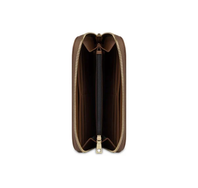 Portafoglio con chiusura con zip, interno con 2 scomparti suddivisi da una tasca portamonete con zip, 2 tasche per banconote, 8 tasche per carte