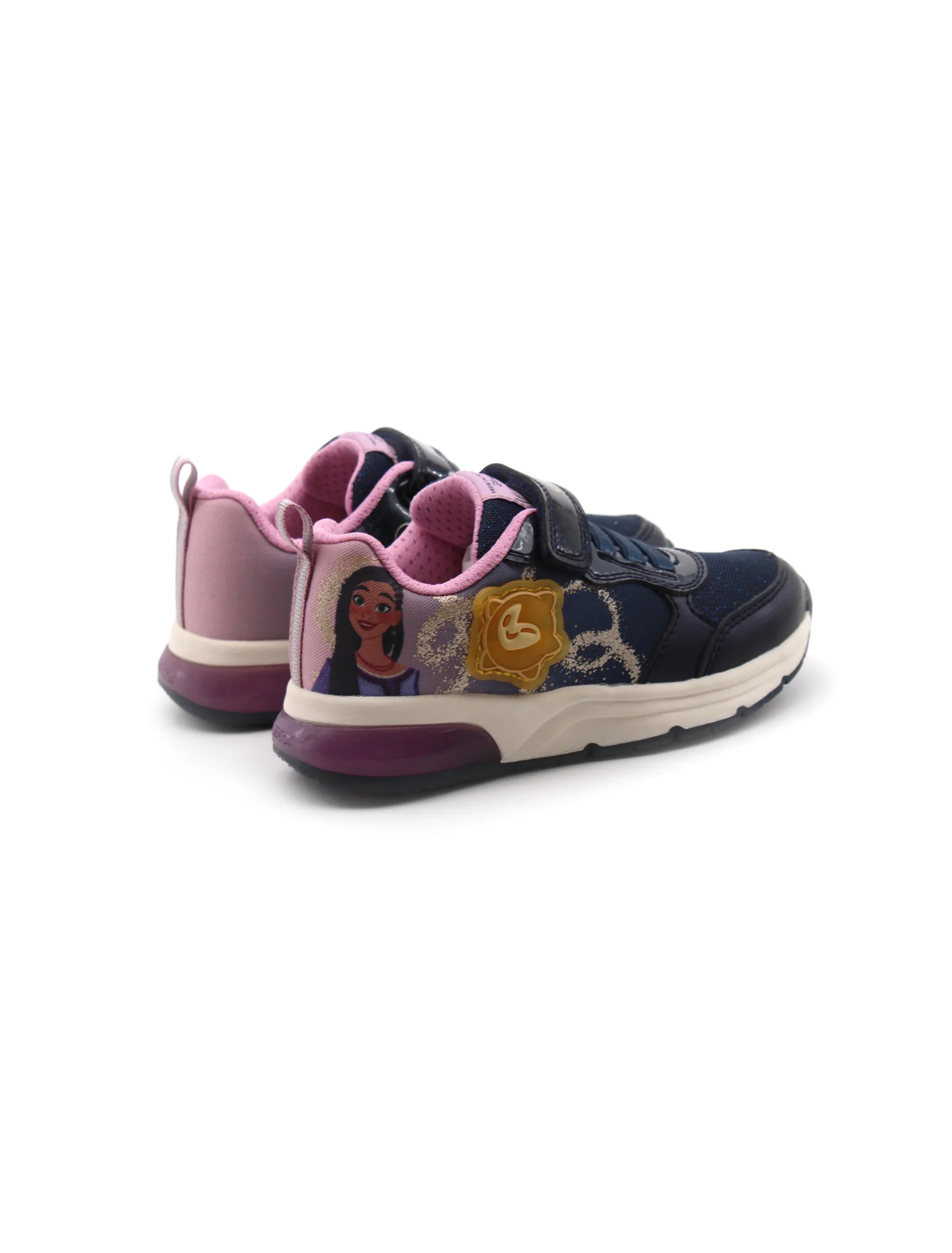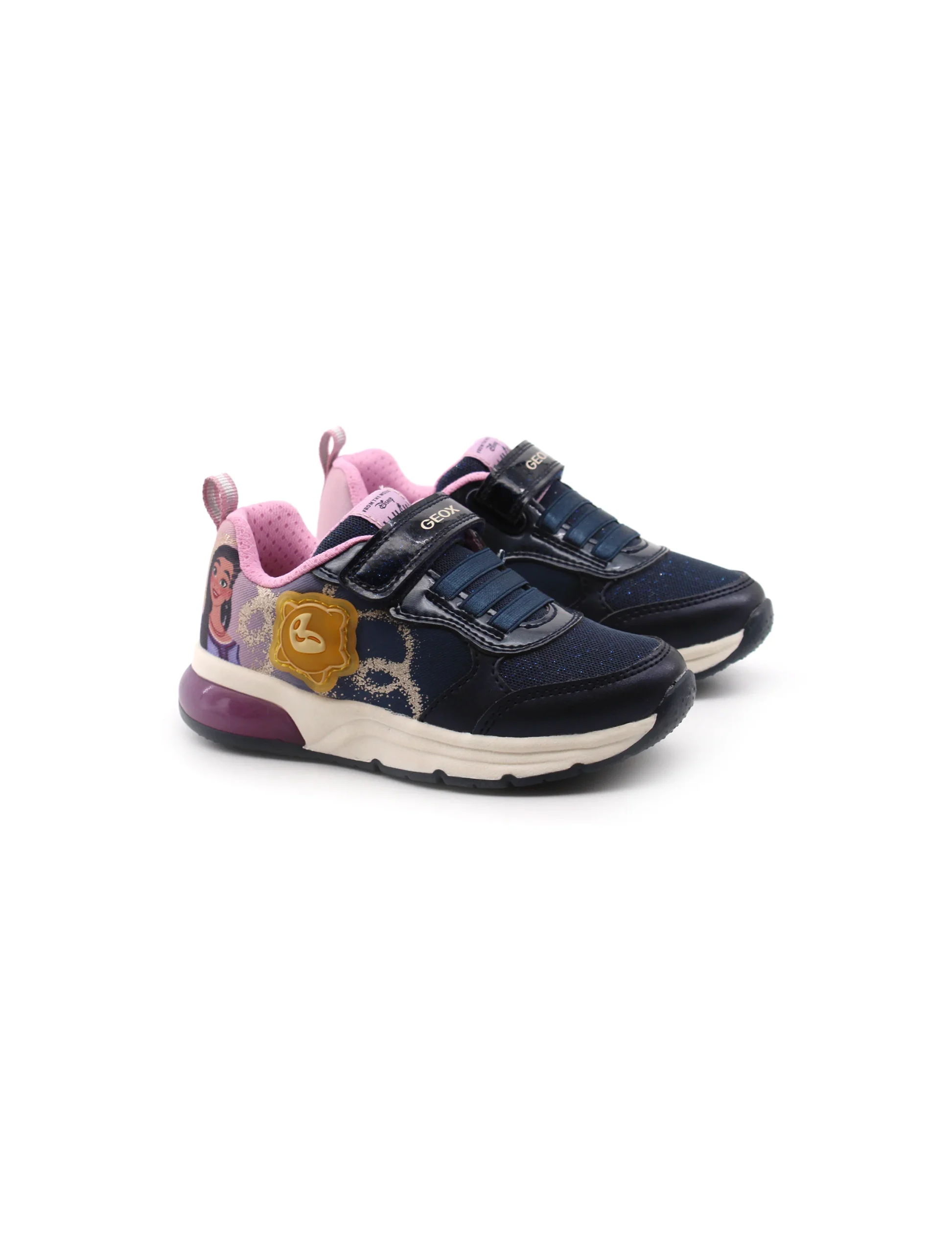 Sneaker con luci da bimba Geox Disney Spaceclub in tessuto con stampe e materiale sintetico con luce laterale, soffice plantare traspirante in tessuto e suola traspirante in gomma con luci. Comoda da indossare grazie alla chiusura con lacci elastici e velcro. Codice Modello: J458VA-0ANAJ