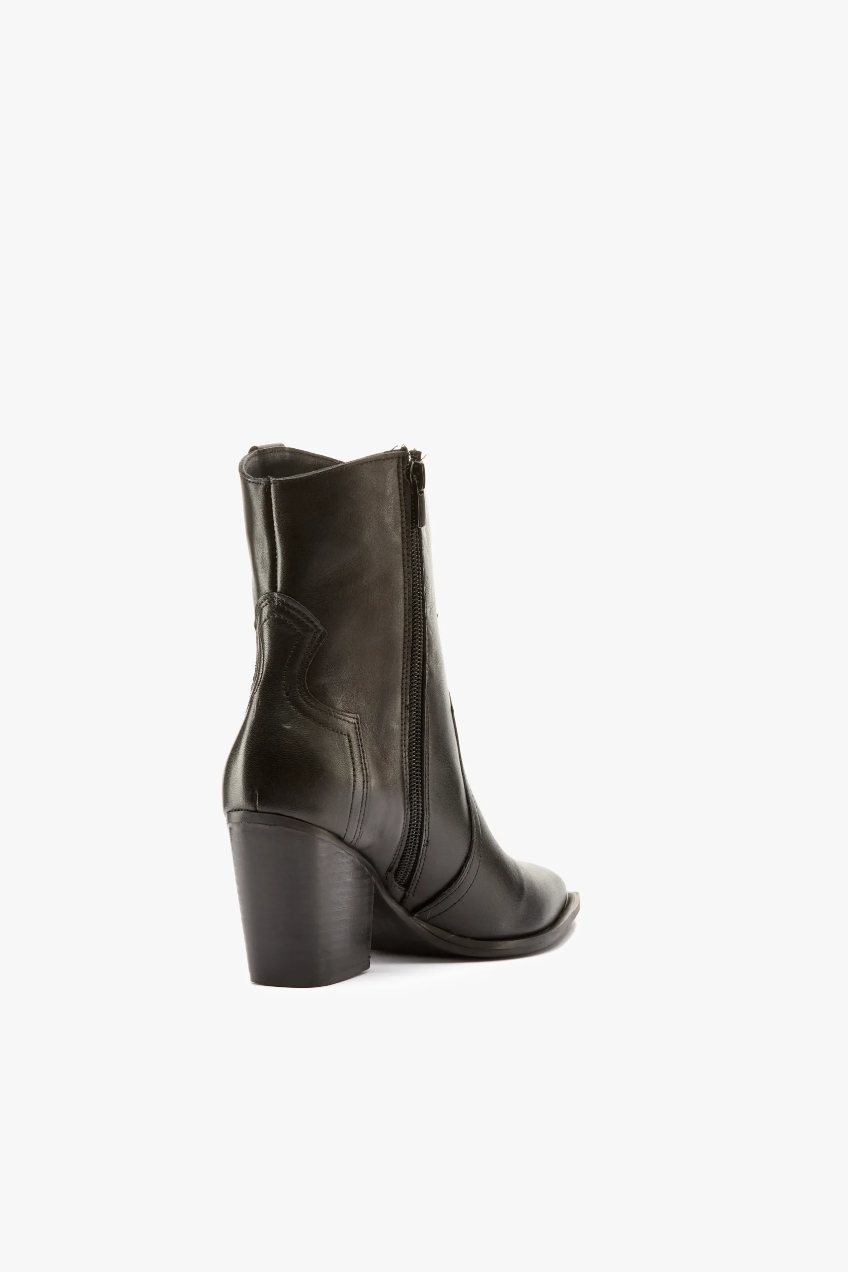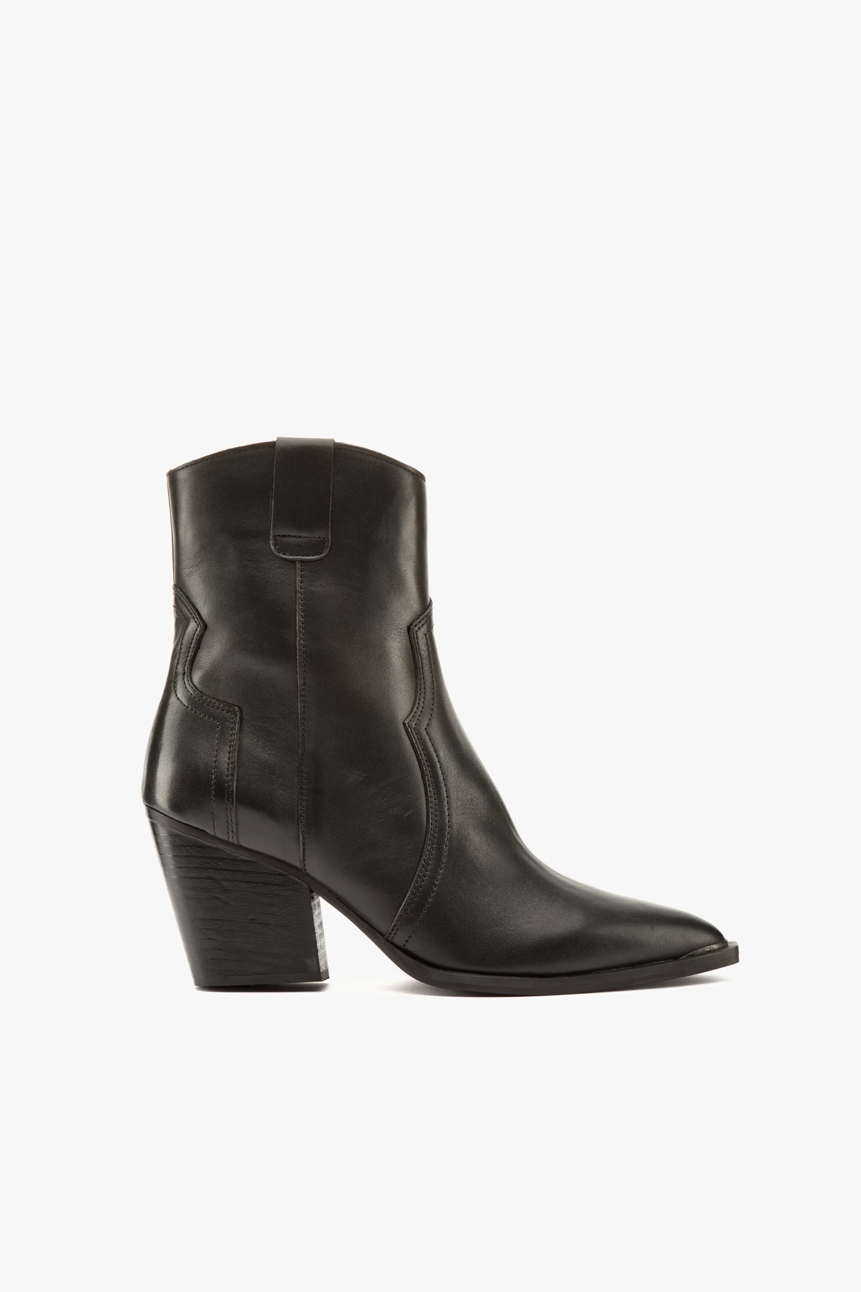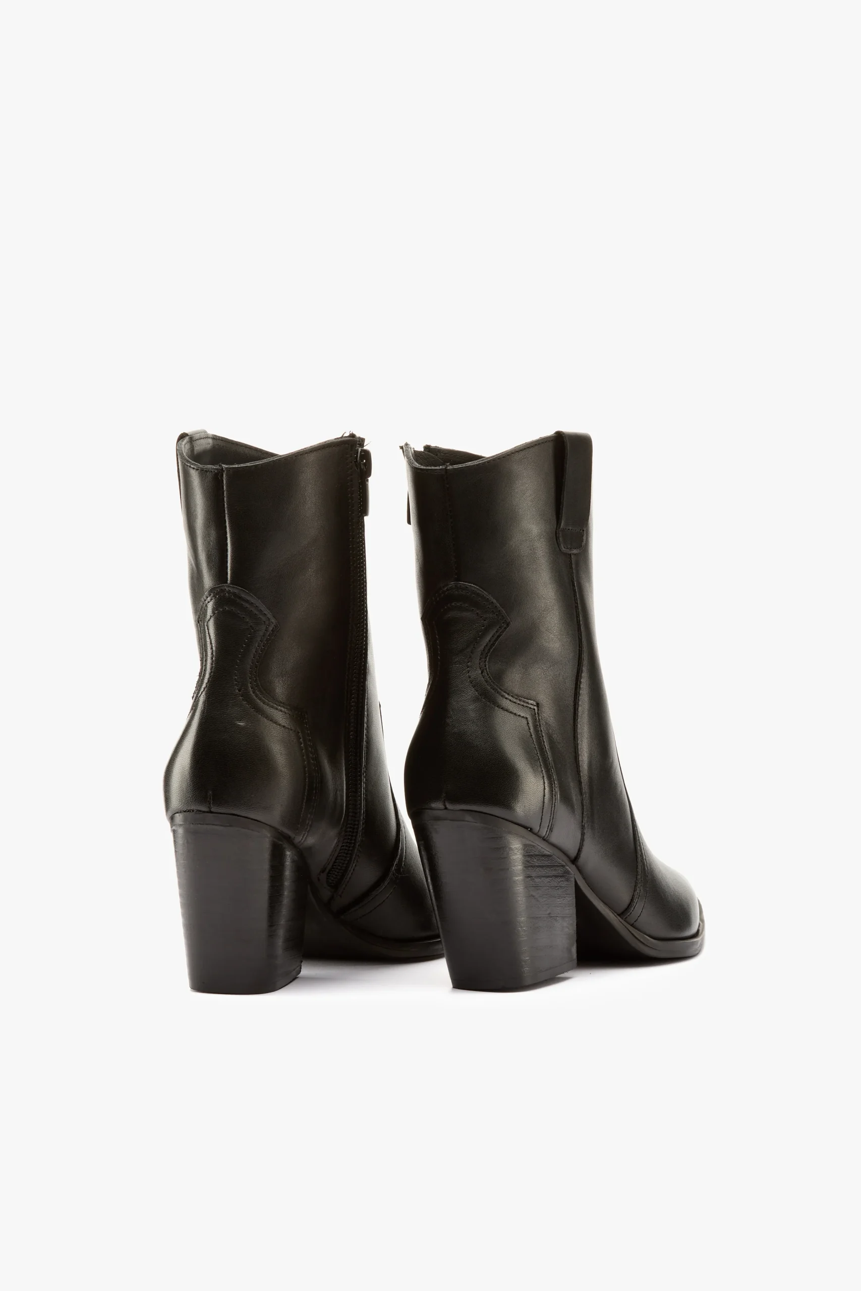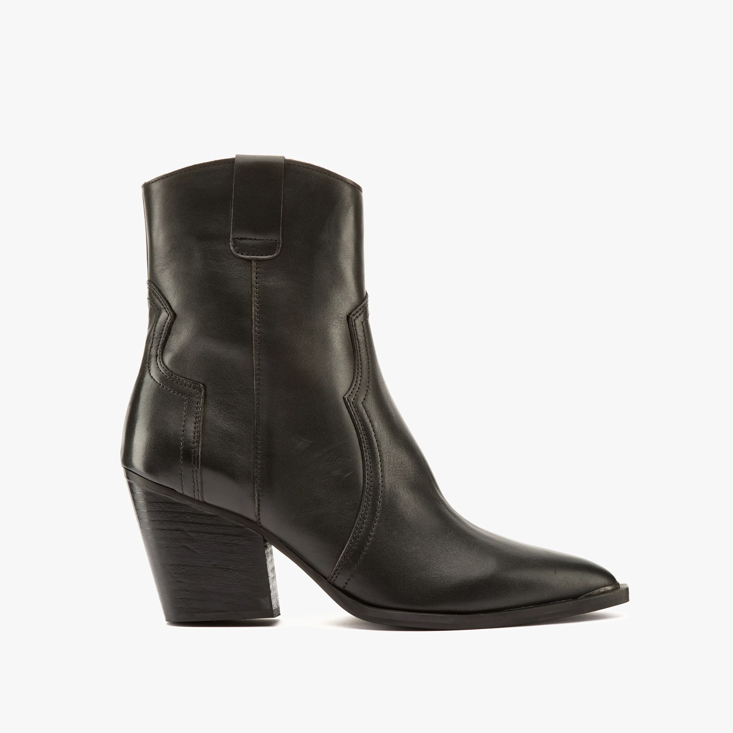 Stivaletto texano in pelle nera con dettaglio punta Sottopiede e fodera in pelle, suola in gomma Altezza tacco 7 cm Calzata regolare