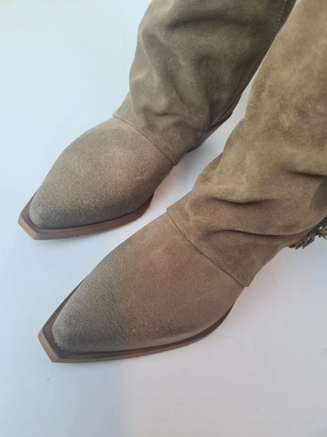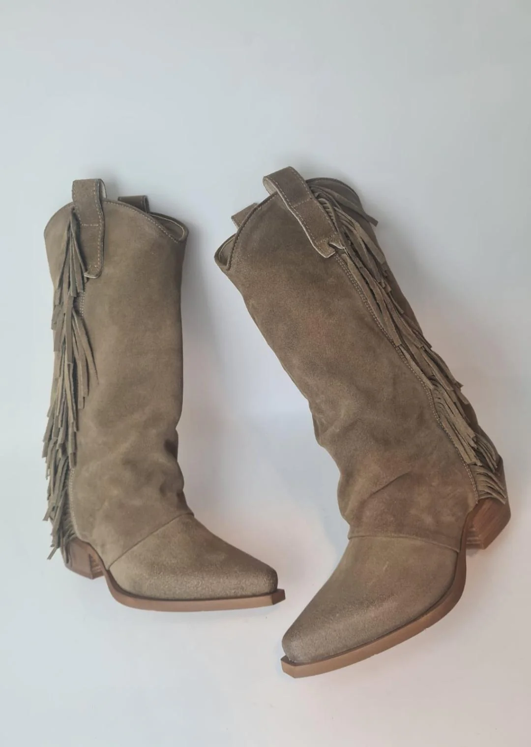 Stivali texani in camoscio con frange color tortora