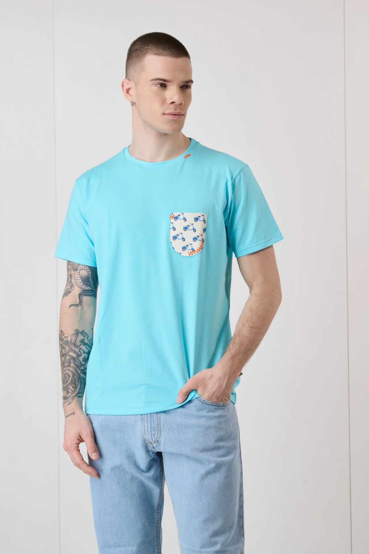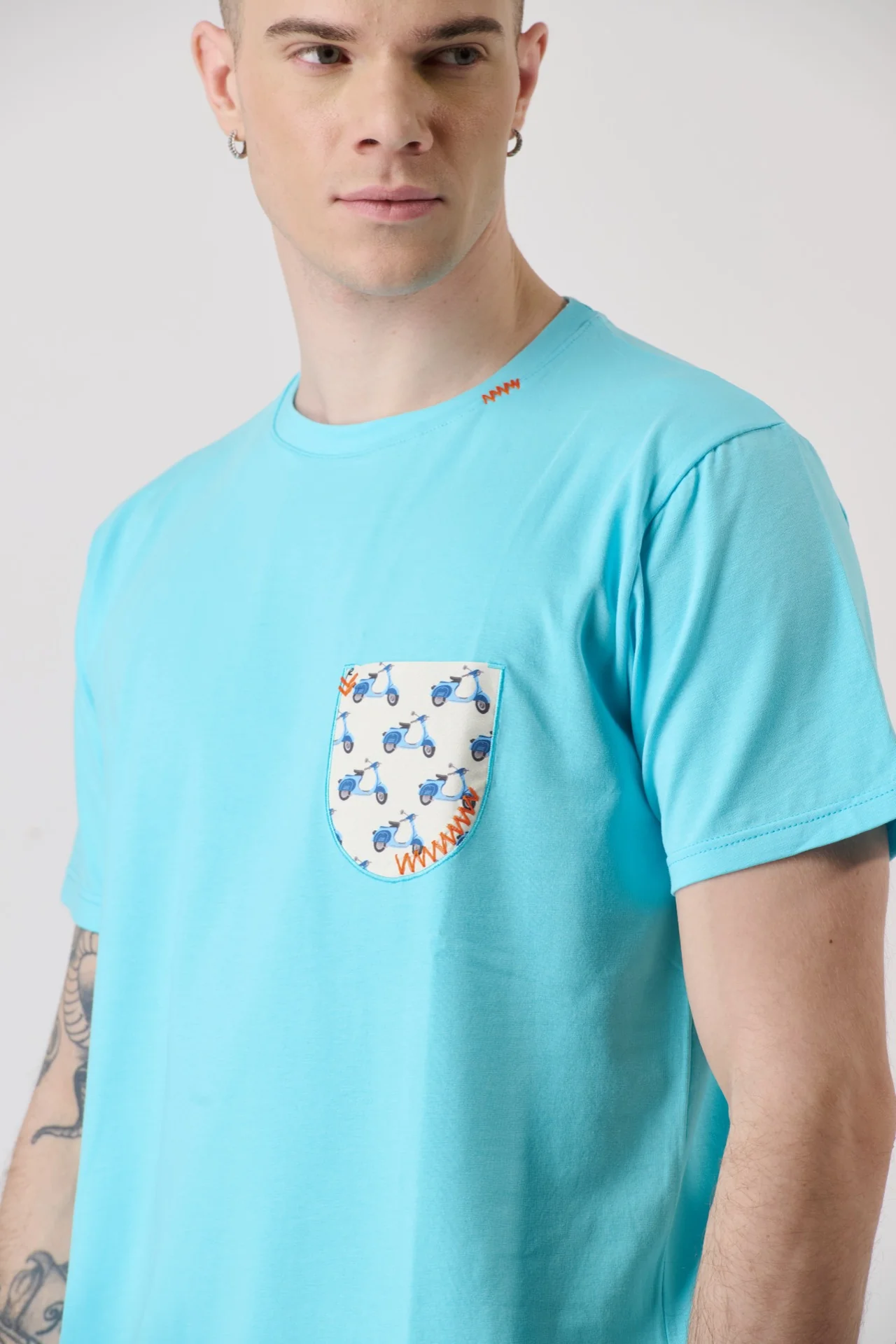 T-Shirt Azzurra con Taschino in tessuto V2 e ricami a contrasto