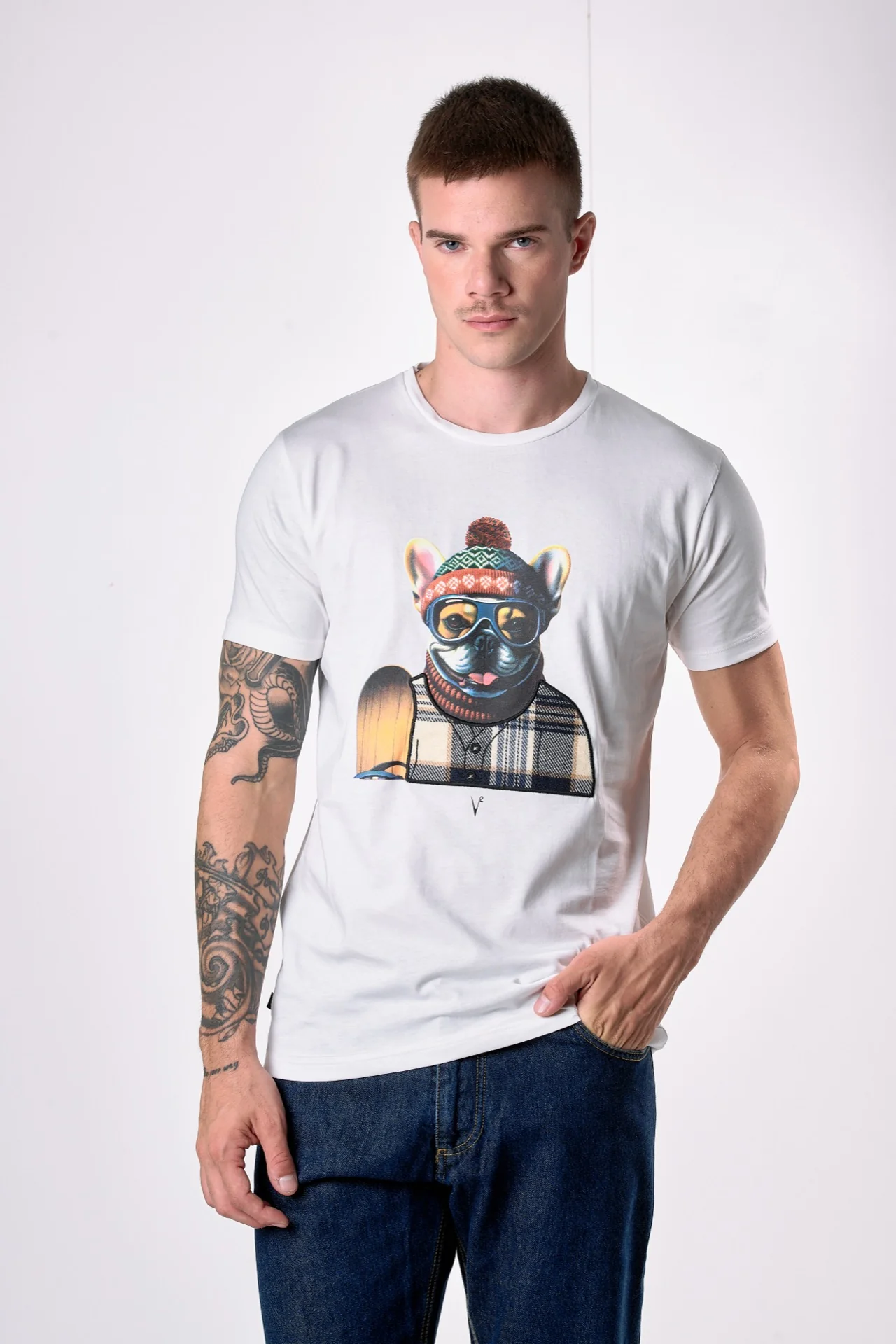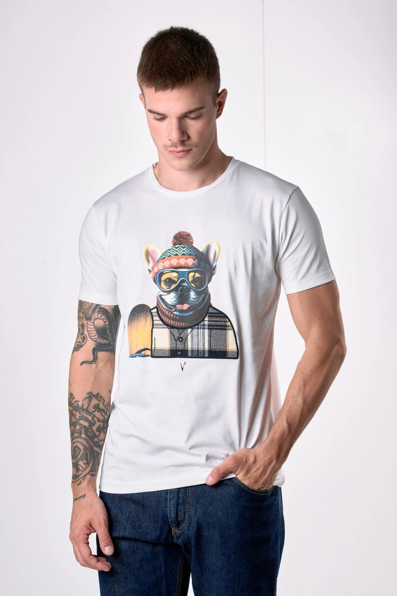 T-Shirt Panna con stampa Bulldog e ricamo in tessuto V2