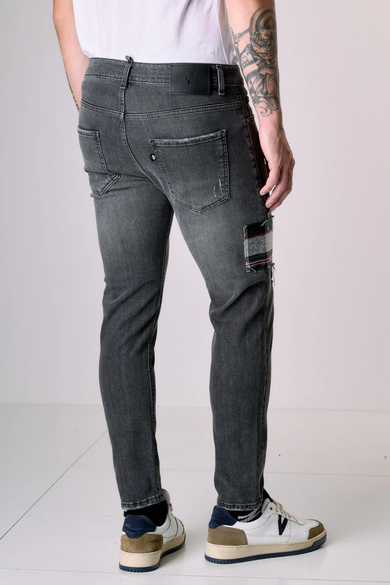 Realizzati in cotone, elasticizzati e con vestibilitร slim. Ogni Jeans viene personalizzato a mano dai nostri artigiani nel nostro laboratorio creativo. L’applicazione in tessuto V2 ne fa un modello unico ed esclusivo. La salpa รจ in ecopelle logata V2 e il bottone in metallo viene forgiato a mano e inciso con il logo V2.