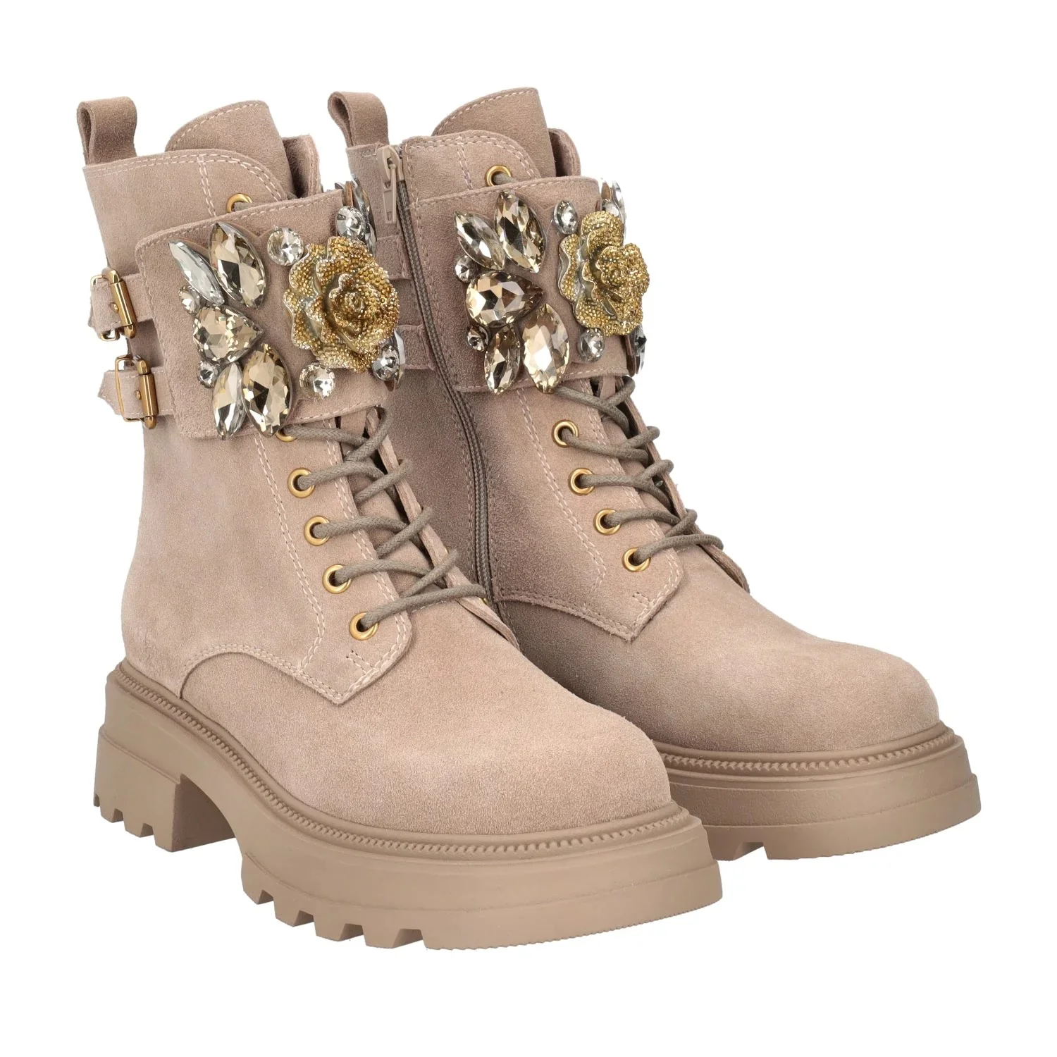 Anfibi eleganti con chiusura con zip laterale e stringhe, accessorio al centro, altezza tacco 4,5 cm