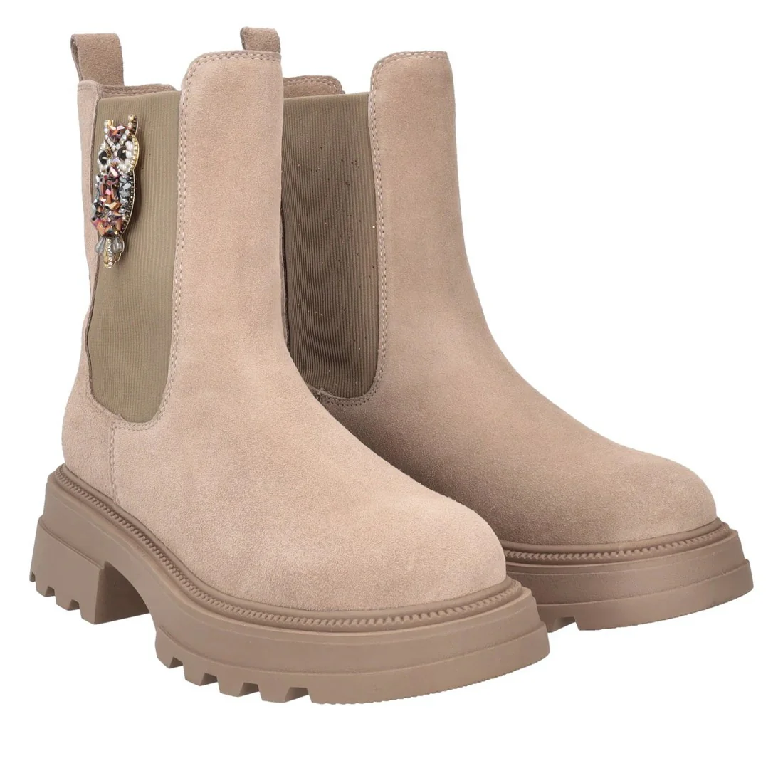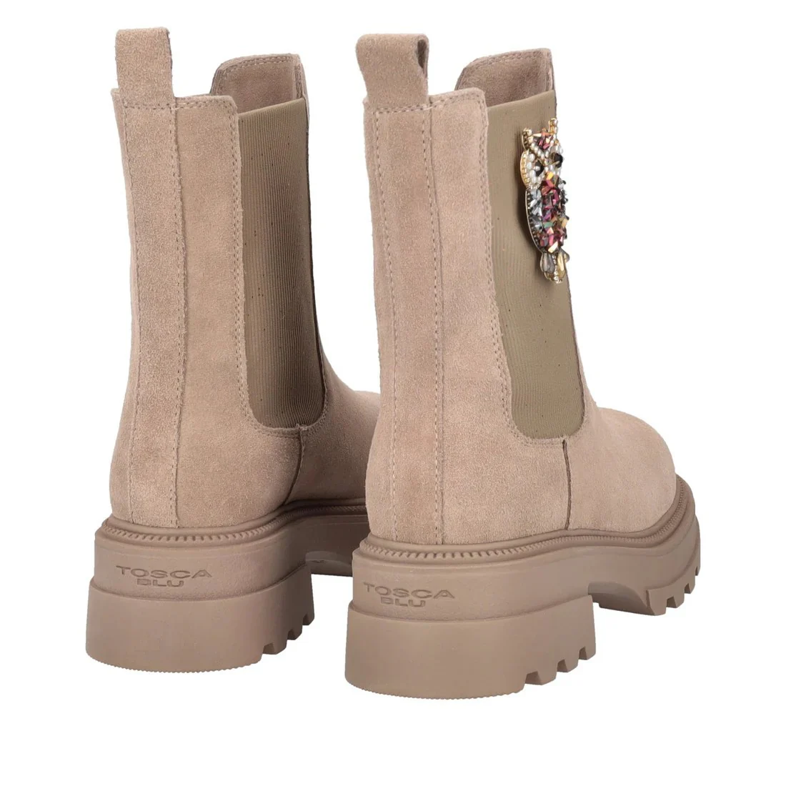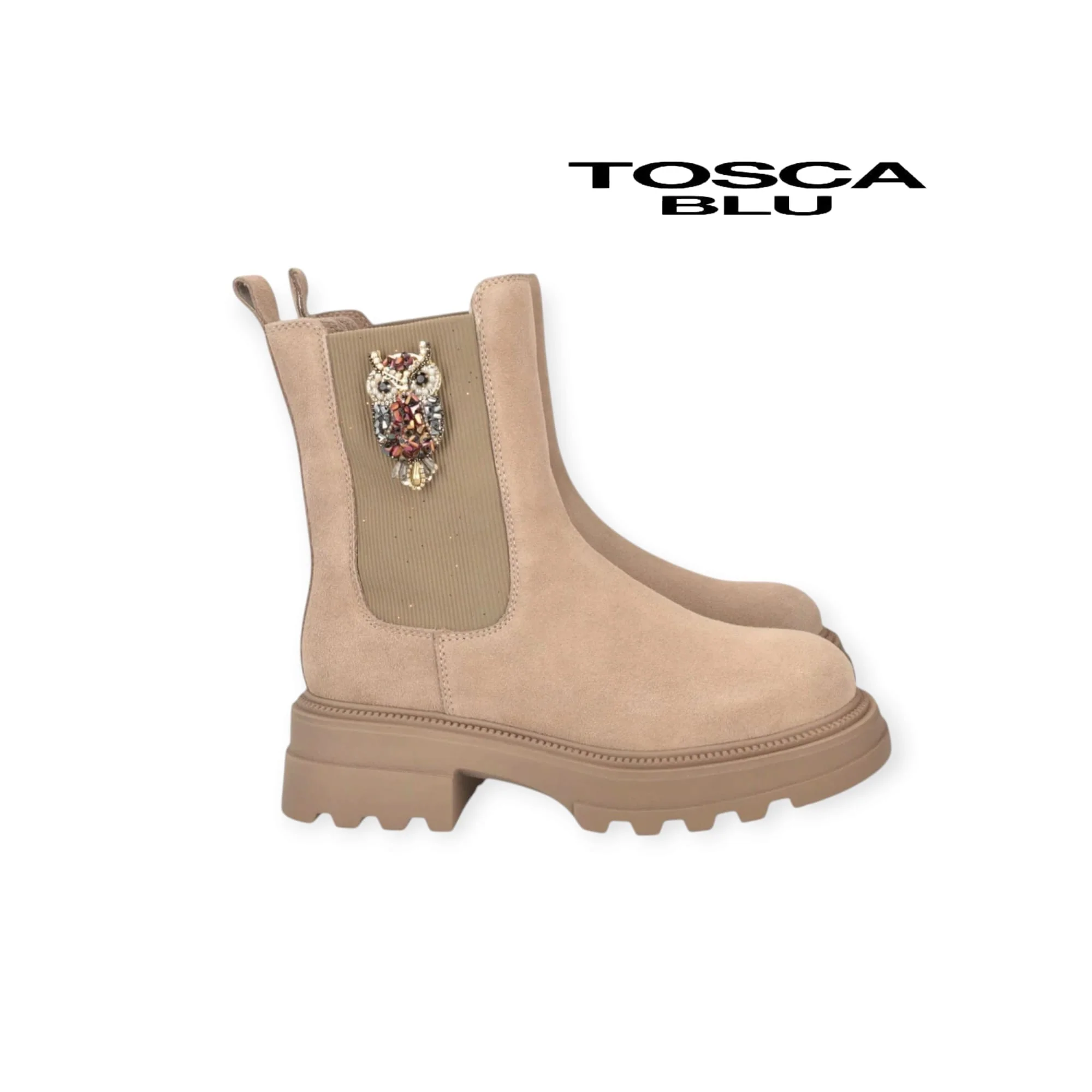 TOSCA BLU BEATLES SF2438S426(SUN VALLEY) BEIGE Tronchetti con elastico laterale, applicazione con strass a forma di gufo, un dettaglio luminoso e originale che rende questi stivaletti un must-have di stagione, altezza tacco 4,5 cm, scritta logo sulla suola