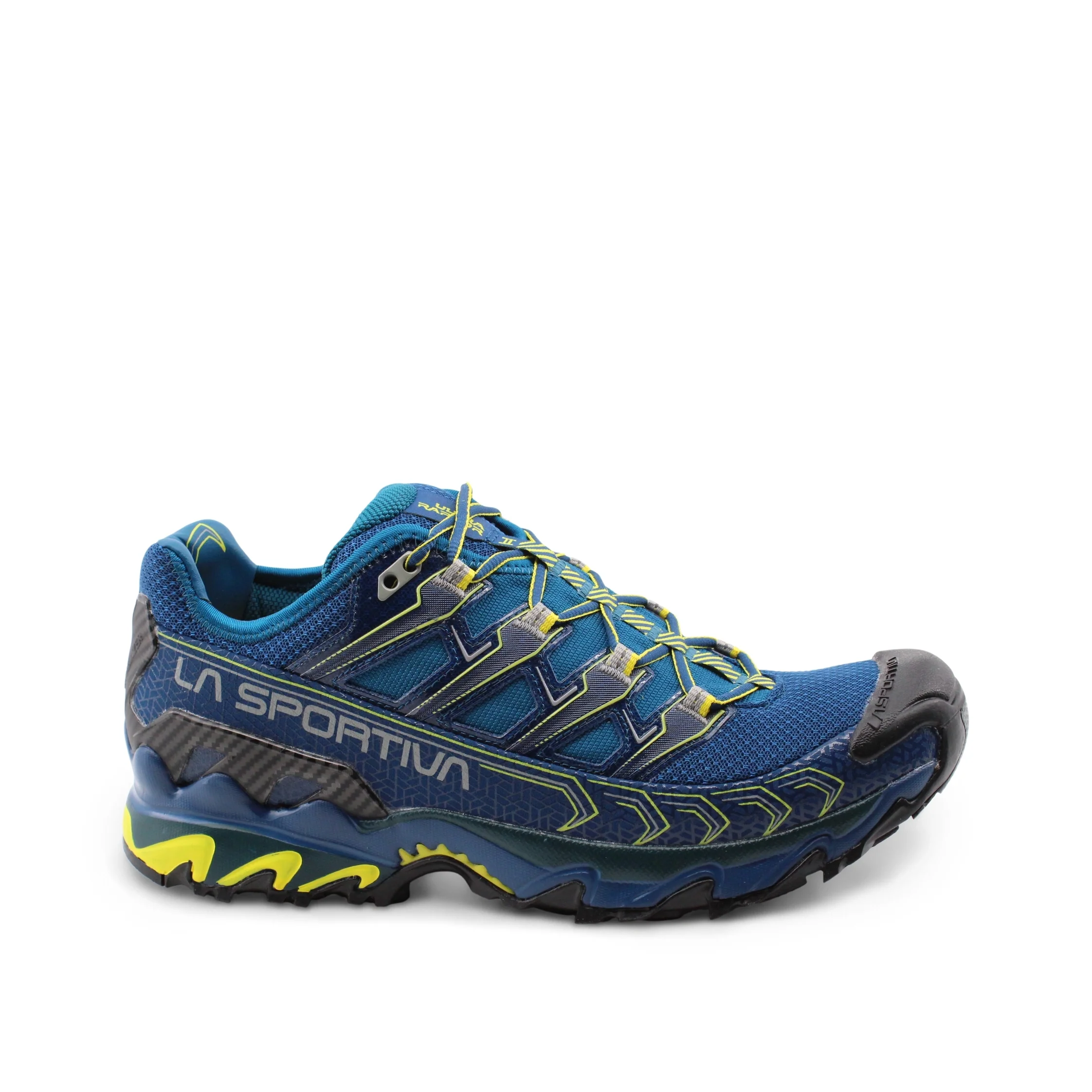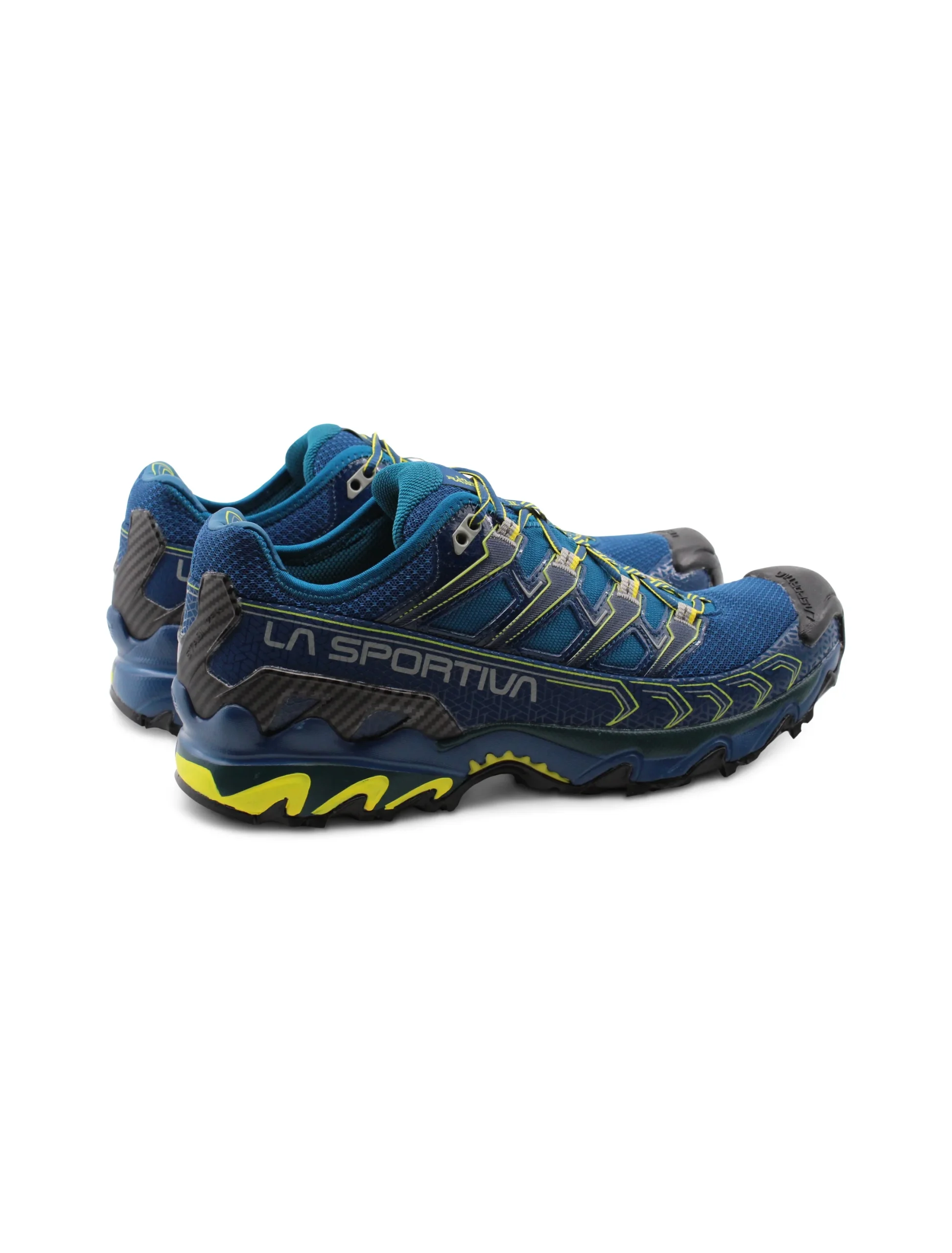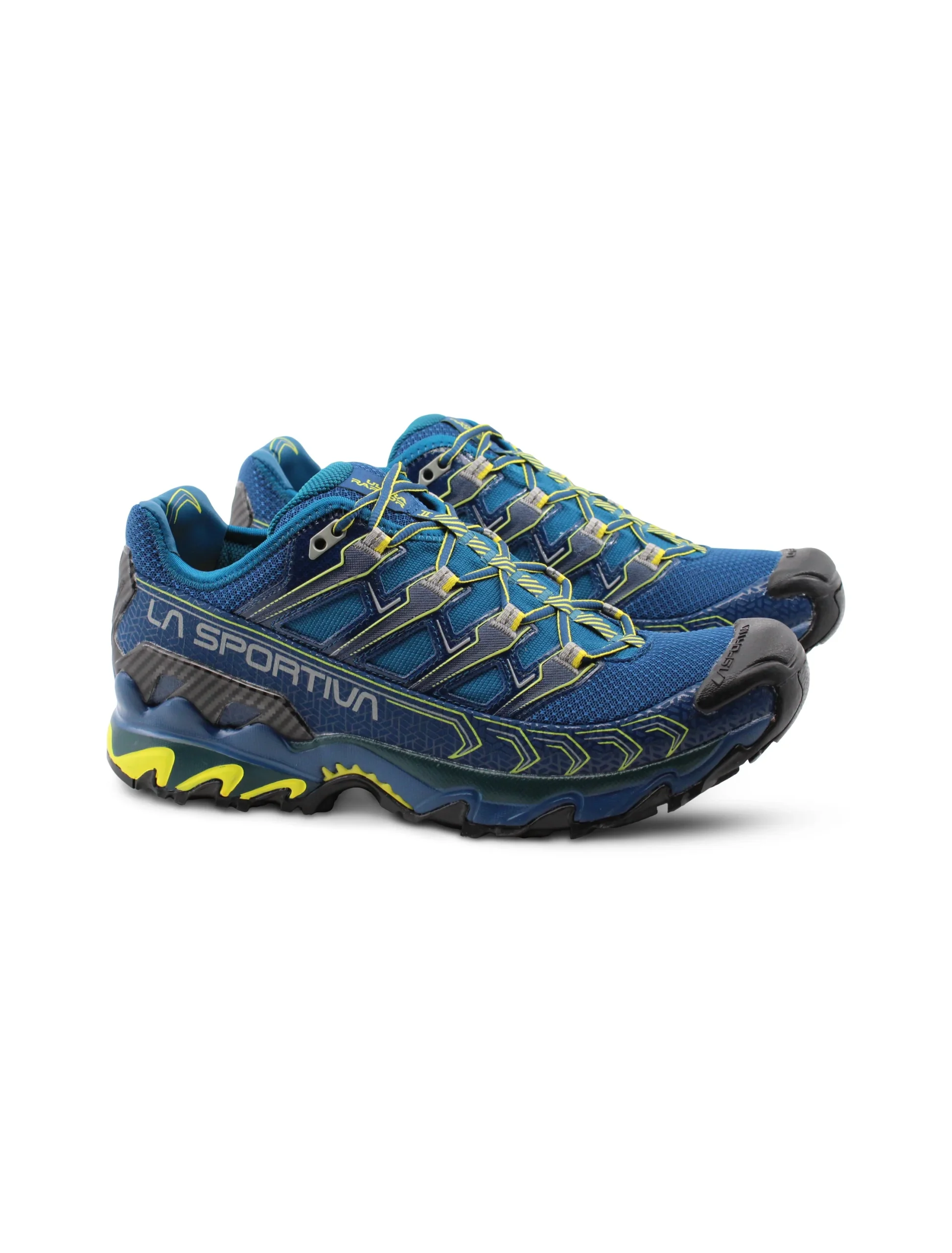 Scarpa da mountain running da uomo La Sportiva Ultra Raptor II in tesssuto e materiale sintetico, con sottopiede removibile Otholite Hybrid in tessuto e suola FriXion in mescola altamente resistente allโabrasione, Impact Brake System e puntalino in gomma anti-urto integrato. Perfetta per utilizzi su terreni off-road e camminate in montagna