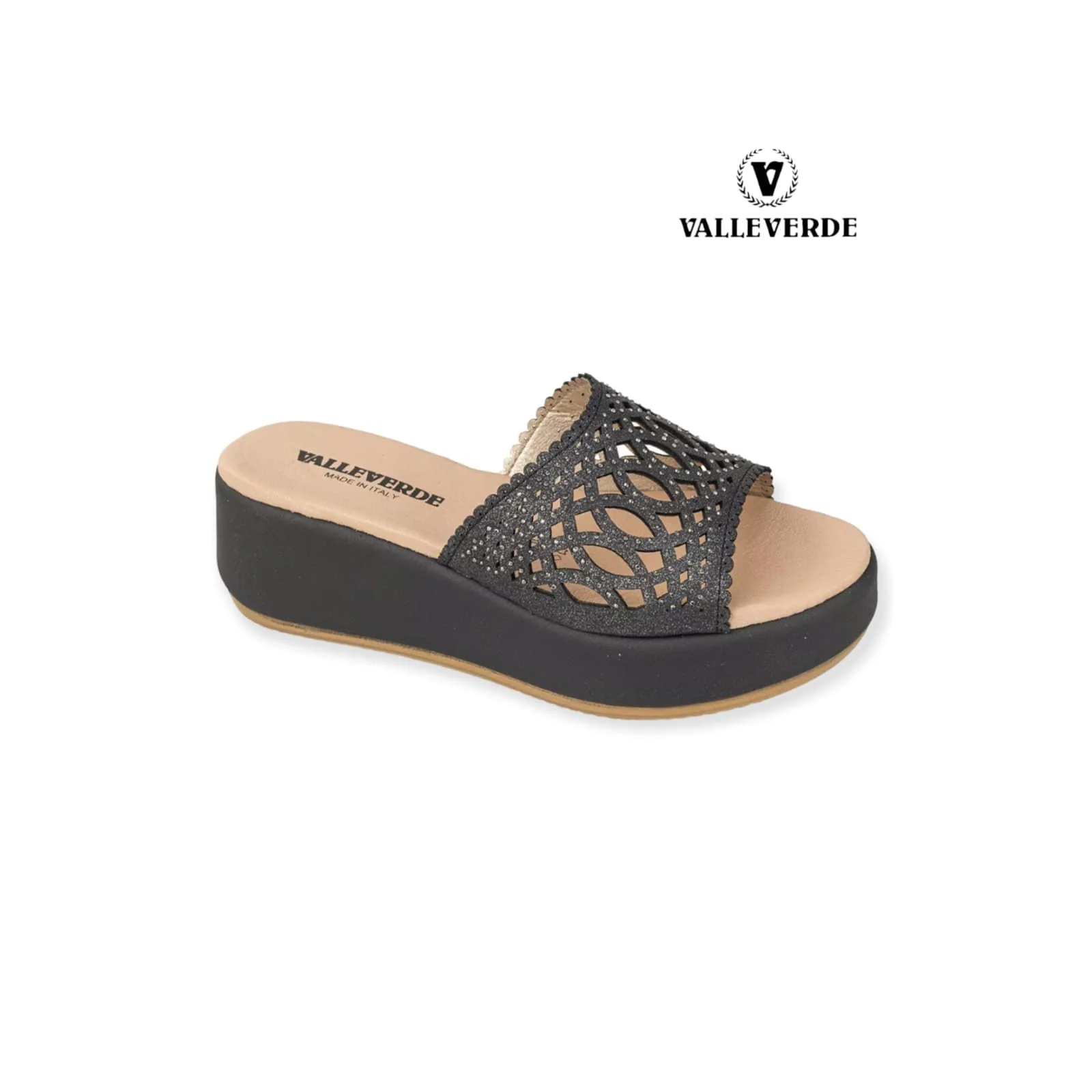 VALLEVERDE CIABATTA 55570 PLATINO NERO Ciabatta dallo stile contemporaneo che offre leggerezza e comfort, facile da indossare, la sua tomaia presenta una maxi fascia con strass che le dona un look deciso. Perfetto per completare gli outfit urban della stagione estiva, aggiunge un tocco di glamour rilassato al guardaroba quotidiano