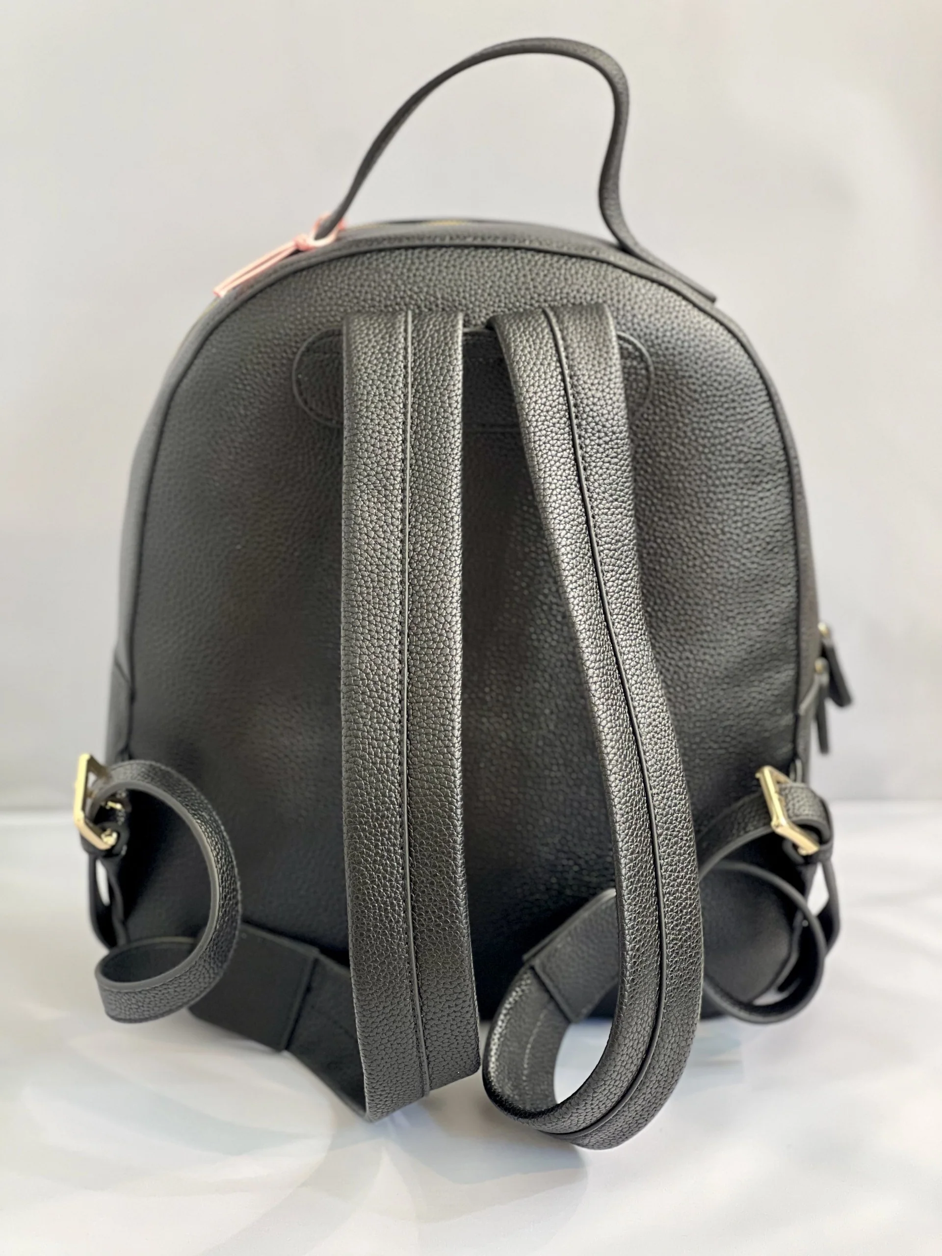 Zaino in similpelle di colore nero, all’interno una pochette totalmente estraibile. Il modello รจ arricchito da una catena removibile dorata con ciondoli raffinati, che aggiungono un tocco glamour al design 27cm x 31cm x 11cm
