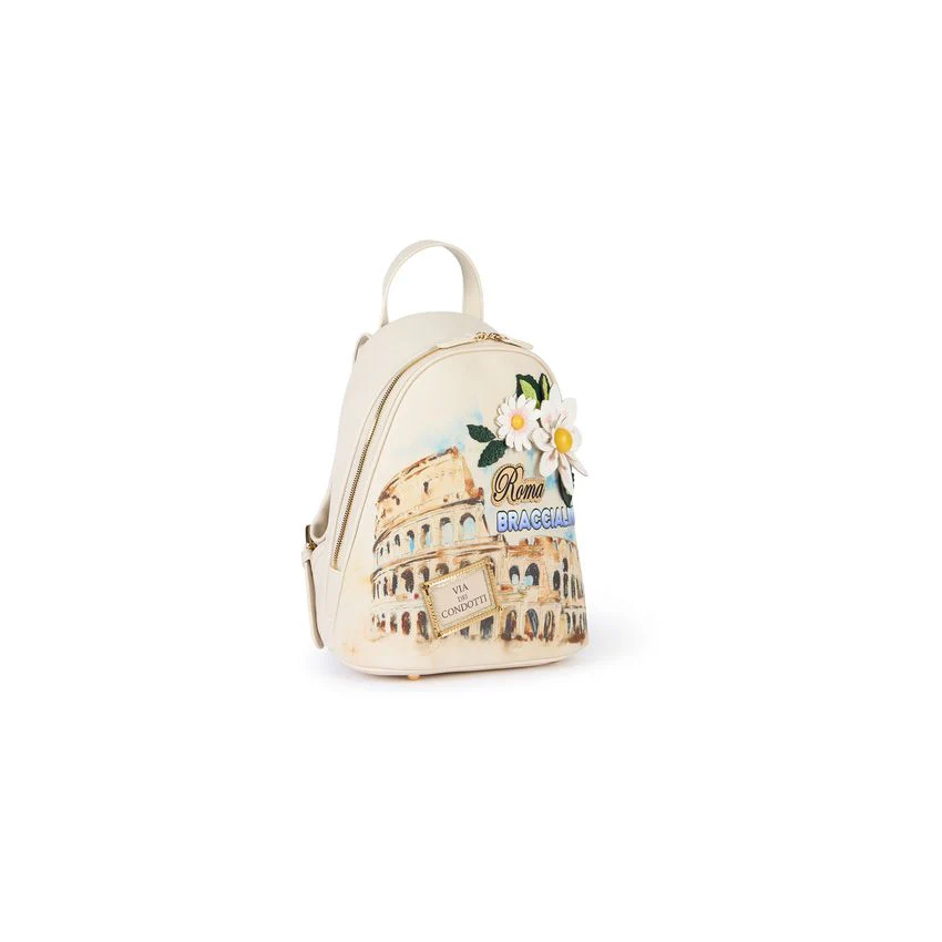Zaino con stampa “Roma”. Manico fisso. Spallacci regolabili. 2 tasche interne, una con zip e due aperte. Chiusura con zip.