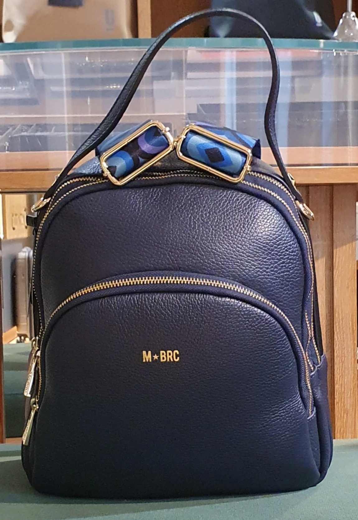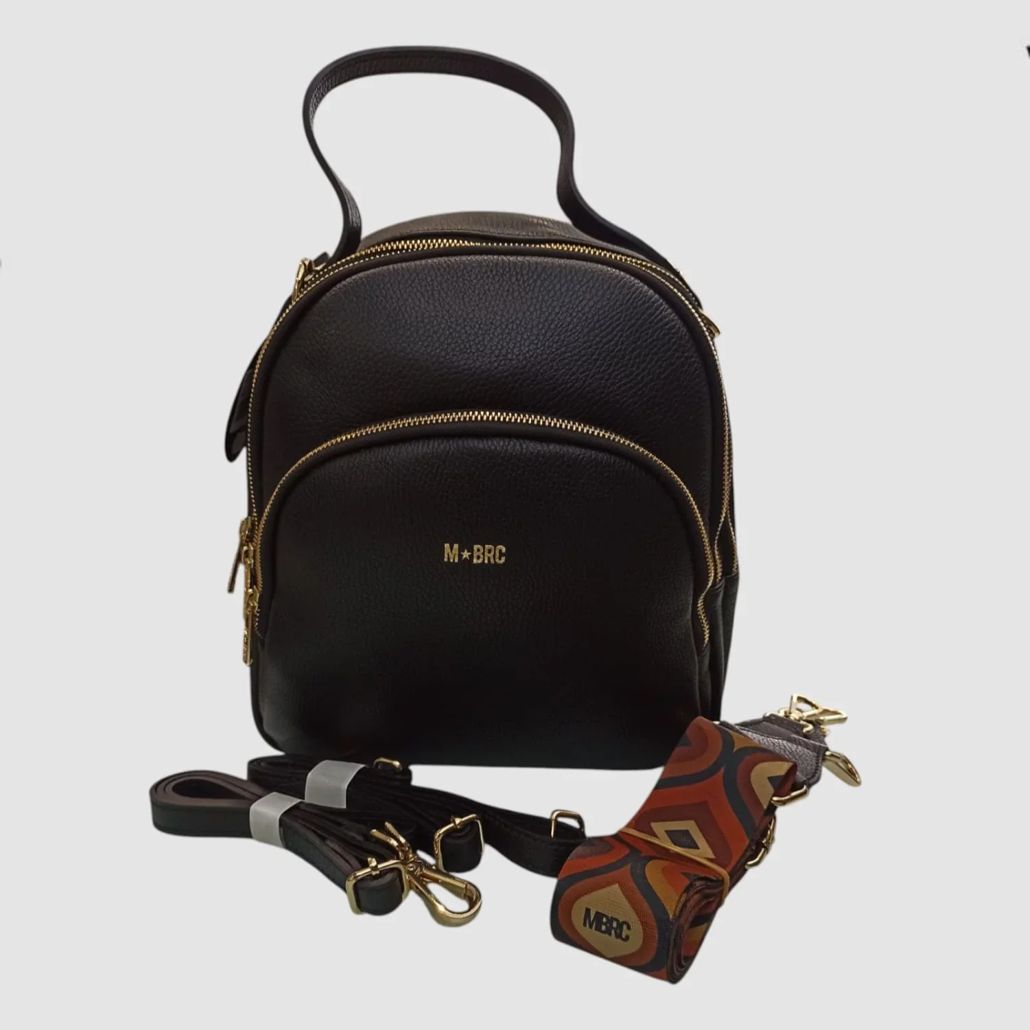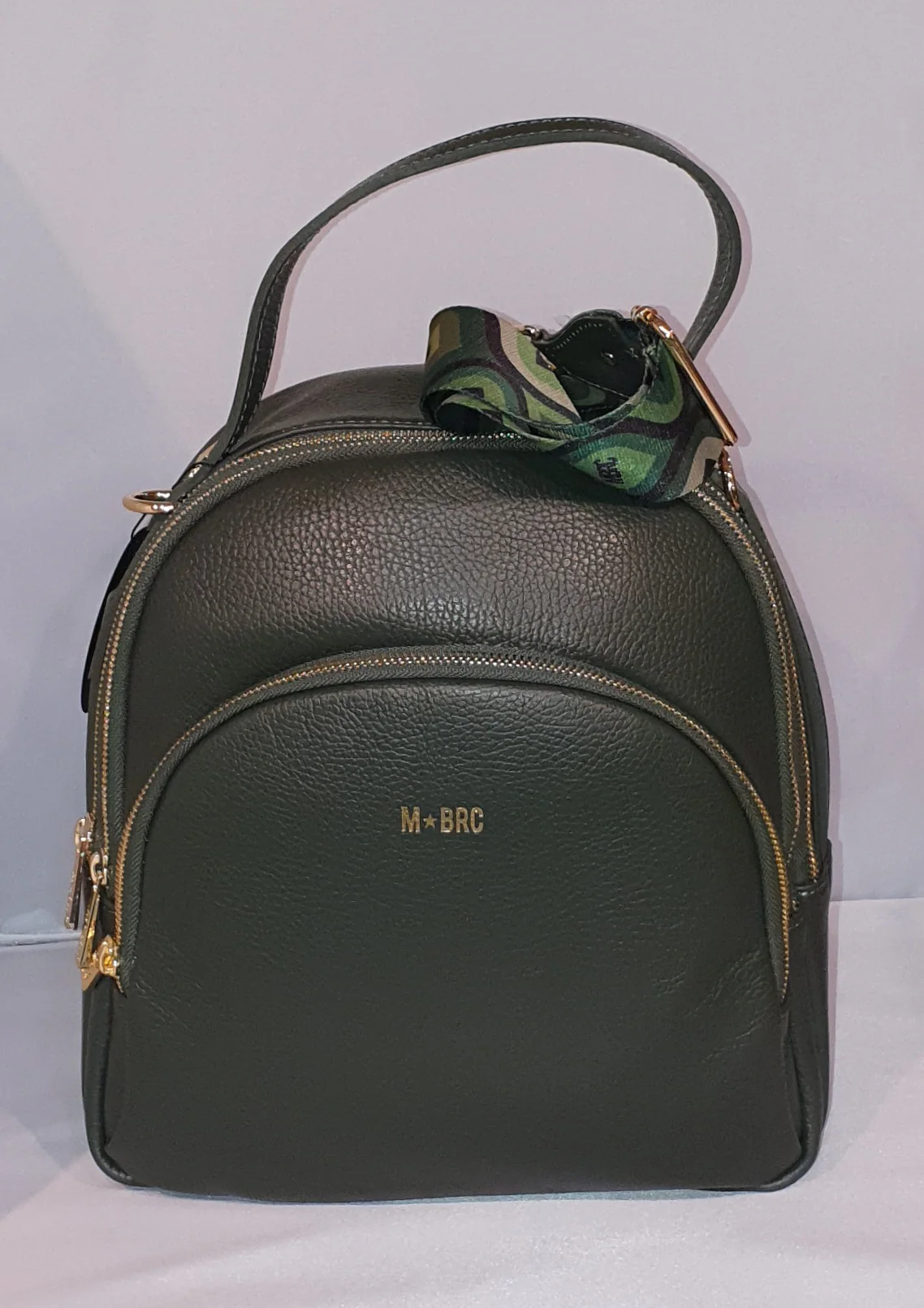Zaino in pelle di MBRC di Massimo Braccialini con 3 zip e con spallacci intercambiabili in tessuto con stampa in fantasia o in pelle dello stesso colore dello zaino. Offre anche la possibilitร di agganciare 1 spallaccio agli occhielli laterali per essere portato come una borsa a spalla/crossbody.